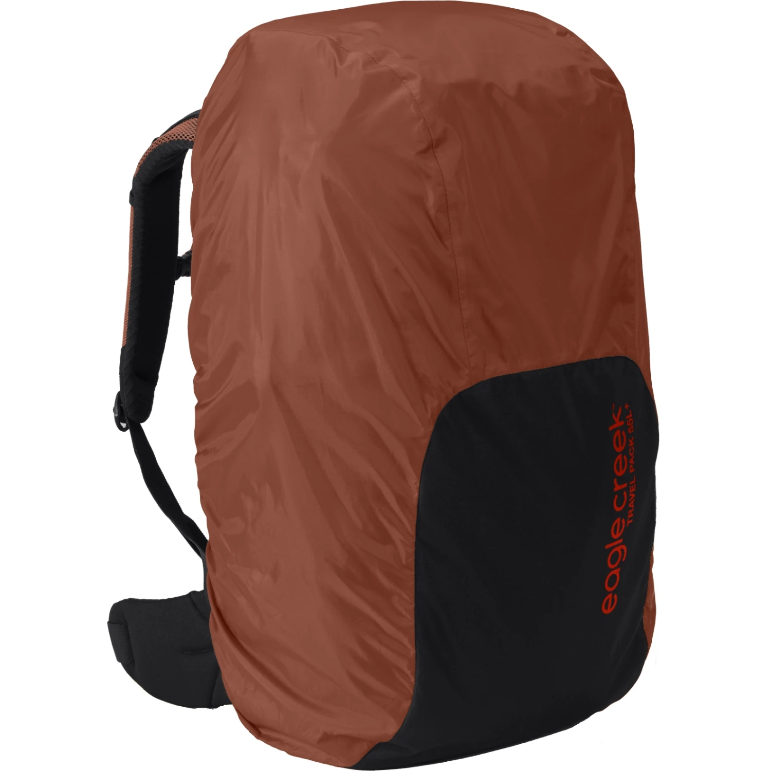 De geĆÆntegreerde regenhoes bergt ook het draagsysteem op bij het inchecken.