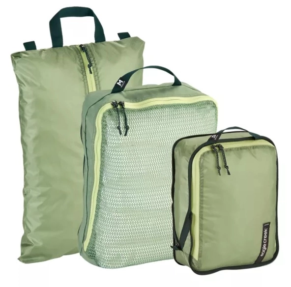 Deze driedelige set organisers voor in uw tas of koffer komt uit de Pack-It™ serie van Eagle Creek. Deze organiser Essentials set is speciaal voor de fanatieke reiziger en is ideaal om uw kleren schoon en gescheiden te houden van schoenen en vuile was. Met deze set pakt u uw tas efficiënt en overzichtelijk in. De set bevat een Shoe Sac, hier past een paar schoenen in plus een paar slippers. Zo maken de schoenen de rest van de tas niet vies. Als tweede bevat deze set een Reveal Clean/Dirty Cube. Deze bevat twee compartimenten met een verstelbare verdeler, zodat de vuile was en schone was gescheiden blijven. Als laatste bevat de set een Compression Cube om de kleren klein in te kunnen pakken, zodat u extra ruimte over houdt voor andere items in uw tas. Deze cube bevat daarvoor twee ritsen. De cubes zijn lichtgewicht, water resistent, hebben sterke handvaten en veerkrachtige ritsen. Ze zijn behandeld met Protx2® om nare geurtjes tegen te gaan. Uw tas en kleren blijven dus ook echt fris. De Reveal Clean/Dirty cube heeft een Mesh gaas en de Compression Cube is van doorzichtige stof, zodat u een snel overzicht heeft van de inhoud. In deze Reveal Clean Dirty Cube is er ruimte voor 15L, in de Compression Cube 5.5L, 8 L wanneer vergroot. De afmetingen van de Shoe Sac zijn: L28 cm x B41 cm, de Reveal clean/Dirty Cube: L18.5 cm x B26 cm x H2.5 cm, en de Compression Cube L18.5 cm x B26 cm x H2.5 cm, wanneer vergroot L18.5 cm x B26 cm x H8 cm. De Essentials Set weegt 211 g.